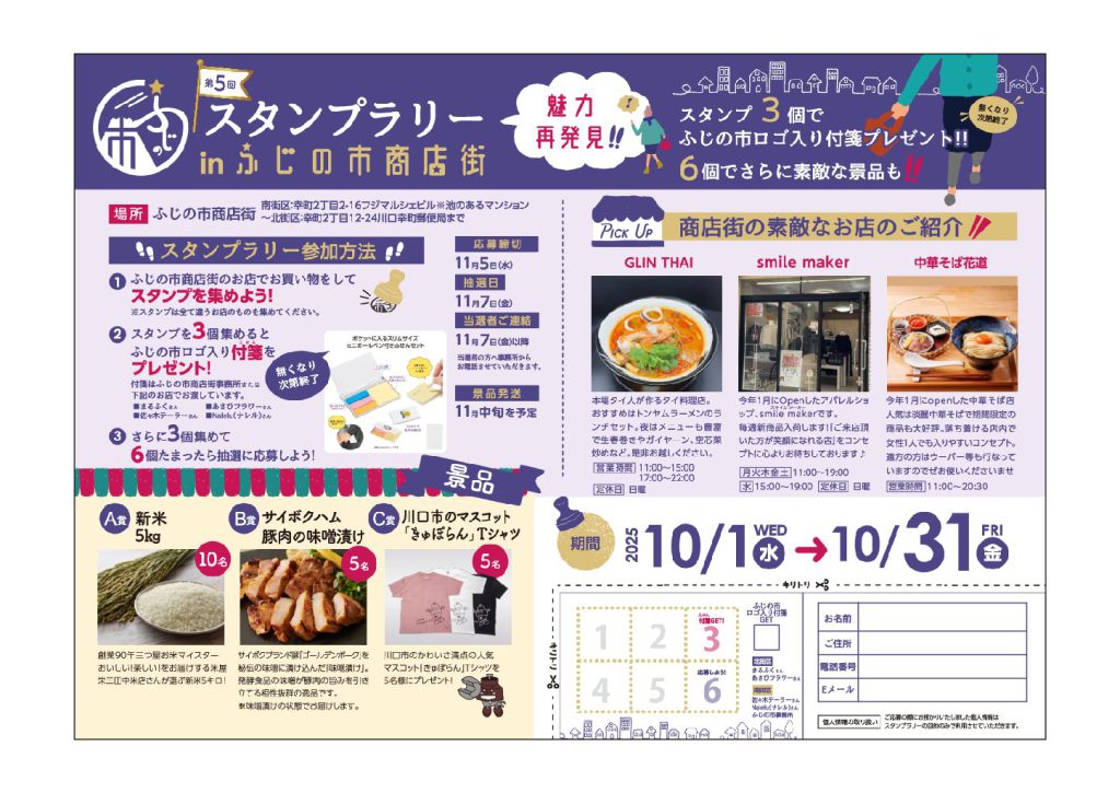 スタンプ3個でふじの市ロゴ入り付箋プレゼント!!6個でさらに素敵な景品もA賞:新米5kgB賞:サイボクハム豚肉の味噌漬けC賞:川口市のマスコット「きゅぽらん」Tシャツ 期間は10月1日~10月31日まで。応募締め切りは1 […]
